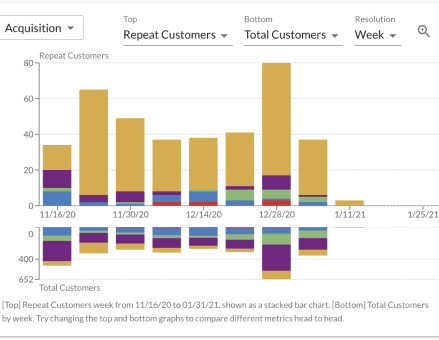 Acquisition Graph Comparing Number of Repeat Customers (Top) and Total Number of Customers Customers (Bottom) Across 5 Different Funnels