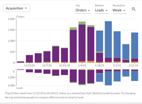 Acquisition Graph Comparing Number of Orders (Top) and Number of Leads (Bottom) Across 5 Different Ad Campaigns