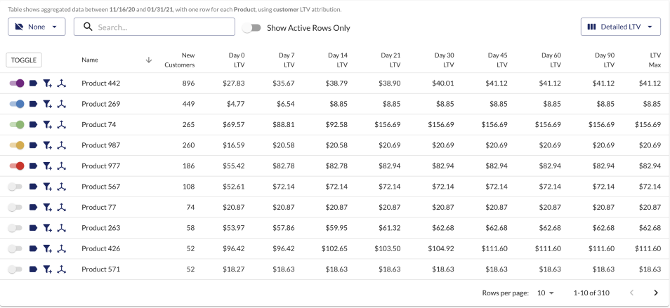 Overview of Table that Displays LTV Of Day 0, 7, 14, 21, 30, 45, 60, 90, and Max Across Different Products