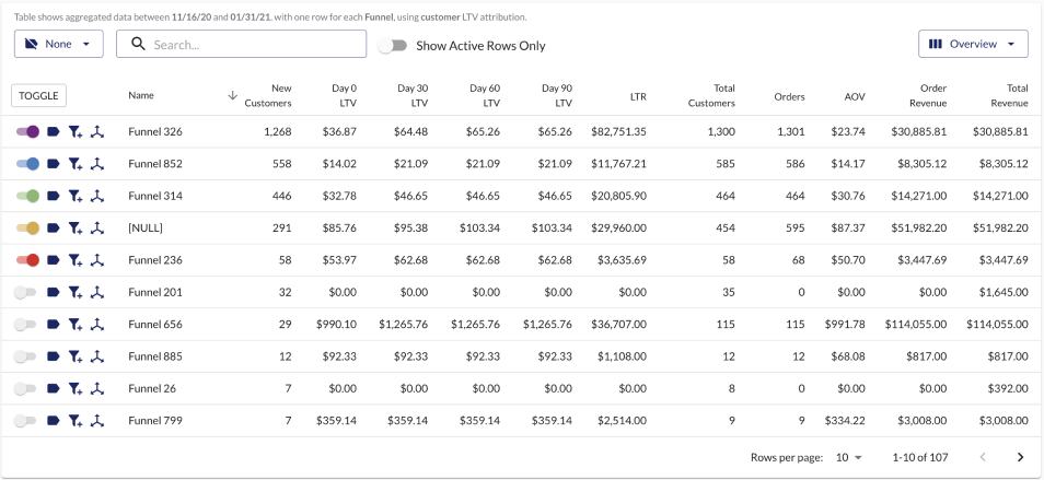 Overview of Table that Compares Different Metrics Across Different Funnels