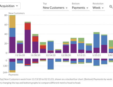 Acquisition Graph Comparing Number of New Customers (Top) and Number of Payments (Bottom) Across 5 Different Ad Campaigns