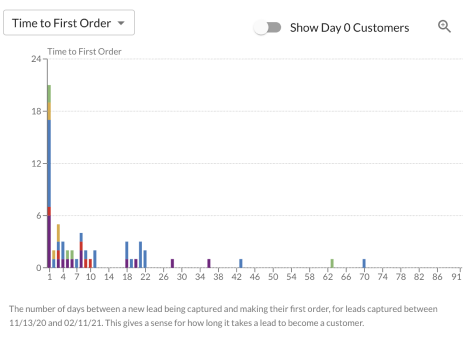 Time to First Order Graph Comparing Funnel Performance Across 5 Different Ad Campaigns Over 90 Days